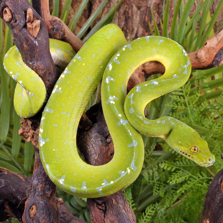 - The Sorong Green Tree Python, scientifically known as Morelia viridis, is a striking reptile recognized for its vibrant coloration and arboreal lifestyle. Native to the rainforests of New Guinea, particularly the Sorong region, this species is a marvel of evolution, adapted to a life spent primarily in the trees. The adult Sorong Green Tree Python is especially celebrated for its vivid green coloration, which provides excellent camouflage among the lush foliage of its habitat. This coloration is often accompanied by shades of yellow, blue, or black, which can vary significantly among individuals and are influenced by genetic factors as well as environmental conditions.As a constrictor, the adult Sorong Green Tree Python primarily preys on small mammals, birds, and occasionally reptiles. Their hunting strategy is adeptly suited to their arboreal environment; they typically remain motionless on branches, ambushing unsuspecting prey that ventures too close. The snake employs impressive patience and striking speed, utilizing its keen sense of smell and heat-sensing abilities to detect movements nearby. Once prey is caught, the python coils around it, applying pressure until the victim succumbs, before consuming it whole. This feeding behavior not only showcases the python’s predatory skills but also highlights the balance of the ecosystem in which it thrives, where each creature plays a vital role in maintaining biodiversity.In captivity, the adult Sorong Green Tree Python has garnered attention among reptile enthusiasts and collectors, valued for both its beauty and intriguing behavior. However, keeping these pythons requires knowledge and commitment, as they have specific habitat and dietary needs to thrive. Owners must create an environment that mimics their natural rainforest habitat, including controlled humidity levels, temperature gradients, and suitable perches. Breeding these pythons is also an exciting prospect for many, as it allows for the development of unique color morphs and patterns. While the Sorong Green Tree Python captivates many with its aesthetics and behavior, conservation efforts are crucial to ensure that these beautiful snakes remain a viable part of their natural ecosystem amid habitat destruction and poaching pressures.