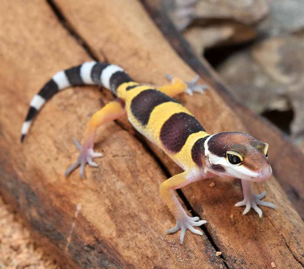 - The normal leopard gecko, scientifically known as Eublepharis macularius, is a popular species of lizard that is native to the arid regions of Afghanistan, Iran, Iraq, and Pakistan. These small reptiles are renowned for their striking appearance, with their distinctive yellow and black spotted patterns covering their bodies. They are also known for their docile nature, making them a popular choice for reptile enthusiasts and beginners alike.In terms of their care requirements, normal leopard geckos are relatively easy to care for compared to other reptile species. They are primarily nocturnal creatures, so they do not require UVB lighting like some other reptiles. Instead, they need a heat source for basking and a hideout for security. Their diet mainly consists of insects such as crickets, mealworms, and dubia roaches, making them affordable and easy to feed. Additionally, they prefer dry environments with low humidity levels, so a simple setup with a substrate like paper towels or reptile carpet is usually sufficient.Normal leopard geckos are also known for their longevity, with an average lifespan of 10-20 years in captivity when properly cared for. They are relatively hardy creatures and are not prone to many health issues if their habitat is kept clean and warm. Additionally, they are known for their unique ability to shed their skin in one piece, a process known as ecdysis. Overall, normal leopard geckos are fascinating creatures that make great pets for those looking to have a low-maintenance reptile companion in their home.