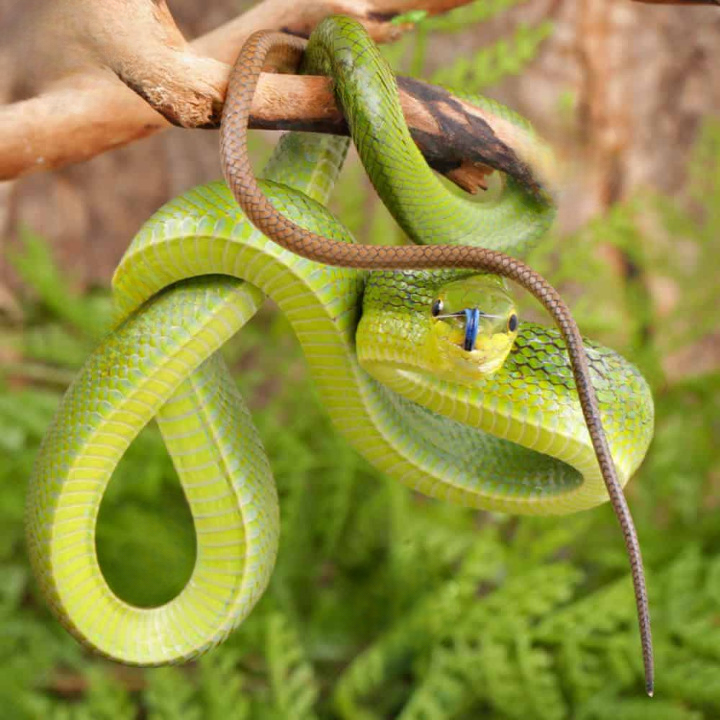 - The Red Tailed Green Ratsnake, scientifically known as Gonyosoma oxycephalum, is a striking non-venomous snake species found primarily in Southeast Asia, particularly in the forests of Malaysia, Thailand, and Indonesia. This snake is notable for its vibrant coloration, which includes a bright green body complemented by distinctive red or orange markings on its tail, providing it with both beauty and camouflage among the foliage of its natural habitat. Adults can reach lengths of up to two meters, showcasing a slender and agile physique that not only aids in their arboreal lifestyle but also enhances their hunting capabilities as they pursue prey among the trees.One of the key ecological roles of the Red Tailed Green Ratsnake is its position as a predator. Primarily feeding on birds, small mammals, and sometimes lizards, this snake employs its exceptional climbing skills to navigate the treetops where it ambushes its prey with precision. Its diet plays a crucial role in maintaining the balance of the ecosystem, as it helps control the populations of these small animals. Additionally, the snake’s ability to climb and glide gracefully through the trees helps it evade larger predators, ensuring its survival in the wild. Its non-aggressive behavior towards humans and other animals further emphasizes its ecological adaptability.In captivity, the Red Tailed Green Ratsnake is appreciated among reptile enthusiasts due to its striking appearance and relatively manageable care requirements. However, as with all species, it is vital to ensure that their natural habitats are preserved and protected from deforestation and habitat degradation. Conservation efforts are crucial for maintaining stable populations of this beautiful snake, as they face threats from habitat loss and illegal wildlife trade. By raising awareness about the Red Tailed Green Ratsnake and promoting responsible pet ownership and conservation practices, we can contribute to the protection of this remarkable species and the biodiversity of its native ecosystems.