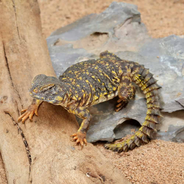 - Yellow Uromastyx, also known as the Saharan Uromastyx or ornate Uromastyx, is a species of lizard native to the deserts of North Africa. Their vibrant yellow coloring makes them stand out amongst the dry, sandy environment in which they live. These lizards are medium-sized, growing up to 15 inches in length, and have a distinct spiny tail that they use for defense against predators.Yellow Uromastyx are herbivores, primarily feeding on a diet of plants, fruits, and vegetables. They have a specialized digestive system that allows them to efficiently break down the tough fibers of the plants they eat. In the wild, they can be found basking in the sun during the day to regulate their body temperature, and burrowing underground at night to avoid predators and maintain their body heat.These lizards make popular pets for reptile enthusiasts due to their striking appearance and relatively low maintenance requirements. However, they do require a large enclosure with plenty of space to roam, as well as a variety of plants and vegetables to mimic their natural diet. As with any pet, it is important to research and understand the specific care needs of Yellow Uromastyx before bringing one home. With proper care and attention, these unique lizards can thrive and bring joy to their owners with their quirky behaviors and beautiful yellow coloring.