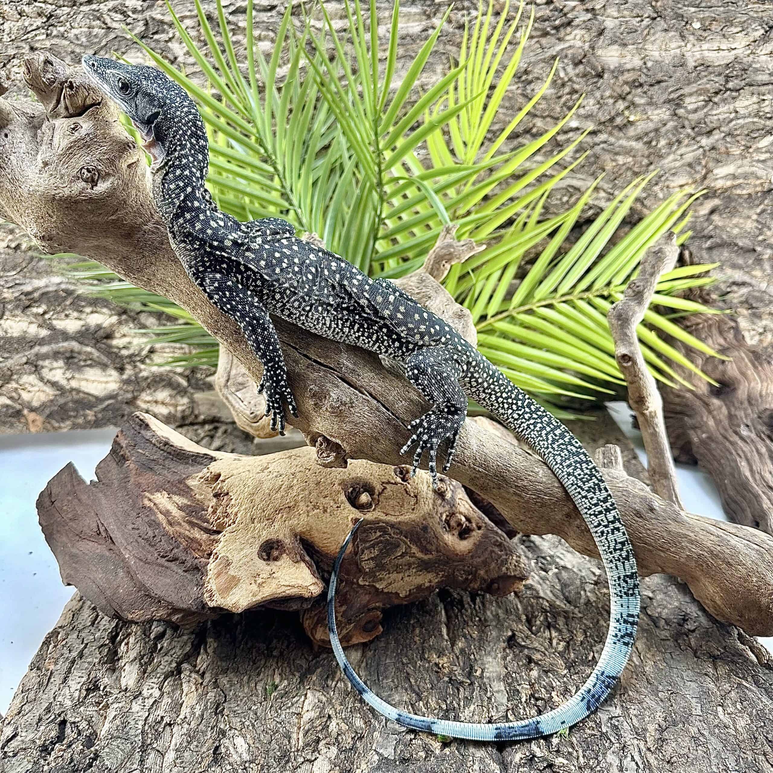 • The Batanta Island Peach Throat Monitor, scientifically known as the Varanus jobiensis, is a species of monitor lizard native to Indonesia. Specifically, they are found on the island of Batanta, which is located in the Raja Ampat archipelago. These lizards are known for their striking peach-colored throats, which serve as a display during courtship and territorial interactions. They are a relatively small species of monitor lizard, typically growing to around 2-3 feet in length.In terms of habitat, the Batanta Island Peach Throat Monitor can be found in a variety of environments, including lowland forests, mangrove swamps, and even agricultural areas. They are primarily carnivorous, feeding on a diet of insects, small mammals, birds, and reptiles. These lizards are also known to be excellent climbers, using their strong limbs and sharp claws to navigate through the trees in search of prey.Unfortunately, the Batanta Island Peach Throat Monitor is considered to be a vulnerable species due to habitat loss and the illegal pet trade. Conservation efforts are underway to protect their natural habitats and regulate the trade of these lizards. By raising awareness about the importance of preserving their environment and cracking down on illegal trafficking, we can help ensure the survival of this unique and beautiful species for future generations to enjoy.