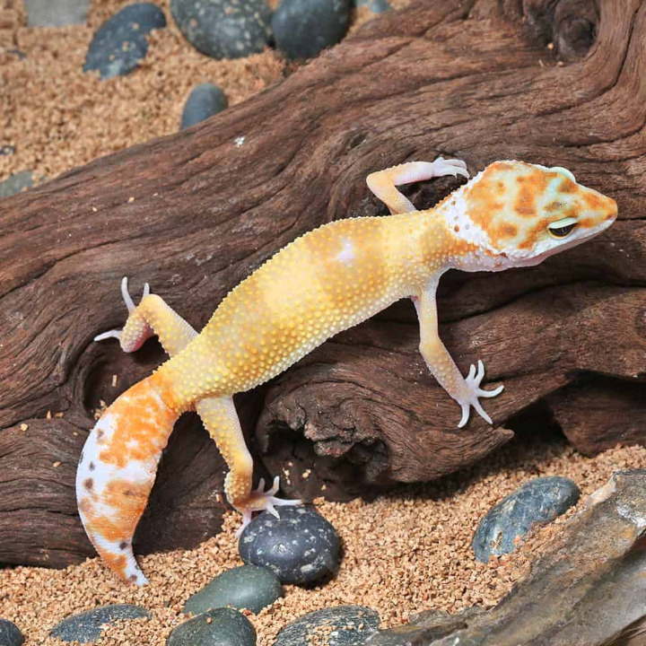- The juvenile Tangerine Leopard Gecko is a popular choice among reptile enthusiasts due to its vibrant orange coloration and striking patterns. As they grow, these geckos develop into stunning adults with a mix of orange, yellow, and white hues that set them apart from other gecko species. Their unique appearance, combined with their docile temperament and easy care requirements, make them an ideal pet for beginners and experienced reptile keepers alike.In addition to their eye-catching appearance, juvenile Tangerine Leopard Geckos are also known for their friendly and sociable nature. They are generally calm and easy to handle, making them a great choice for families with children or individuals looking for an interactive pet. With proper care and handling, these geckos can become quite tame and even enjoy being petted and hand-fed by their owners. Their playful and curious behavior makes them a delightful addition to any reptile lover’s collection.As with all reptiles, it is important to provide the juvenile Tangerine Leopard Gecko with a suitable habitat that meets their needs. This includes a properly sized enclosure with appropriate substrate, hiding spots, and heating elements to ensure their health and well-being. Regular feeding and supplementation with calcium and vitamins are also essential to keep these geckos healthy and thriving. With proper care and attention, the juvenile Tangerine Leopard Gecko can live for up to 15-20 years in captivity, providing their owners with years of enjoyment and companionship.